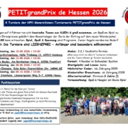 /in Breitensport, Jugend, Sport, Termine /von Stefan BoniferGude! Der Anmeldeschluss für das erste PETITgrandPrix des Jahres 2026 naht. Wer am 15.03.2026 in der Halle in Klein-Krotzenburg (Hainburg) noch mit dabei sein möchte (und dies noch nicht kundgetan hat), meldet sich bitte bis spätestens 10.03.2026 per E-Mail an jugend@hessenpetanque.de oder per WhatsApp an 0151 / 56351050 an. Aktuell sind 17 der 25 vorhandenen […]